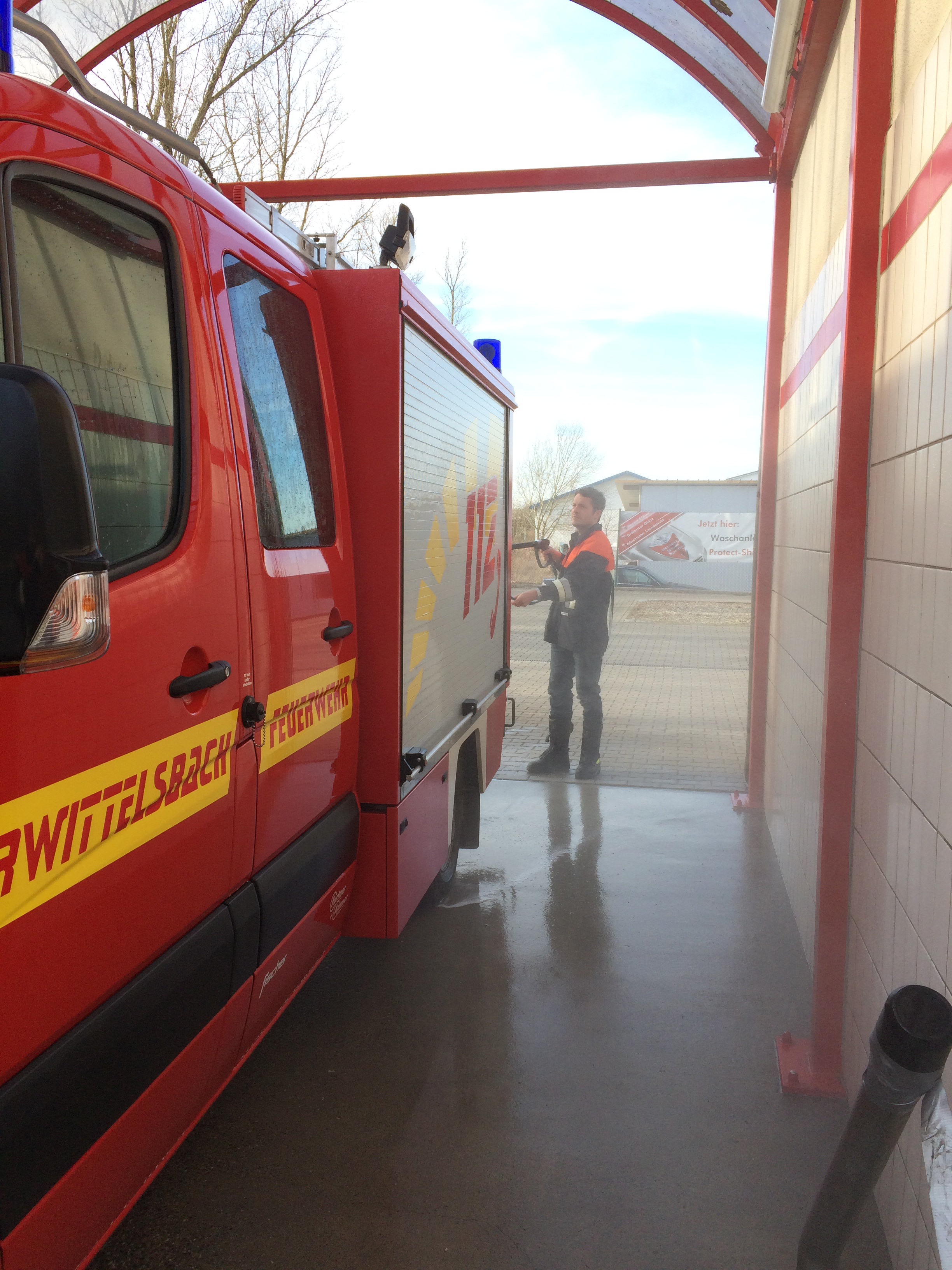 Damit das Feuerwehrauto bei der Absicherung des kommenden Radrennens glänzen kann, wird es mit dem Dampfstrahler ordentlich von Streusalz und allen anderen Resten des Winters befreit (Waschplatz in Radersdorf).