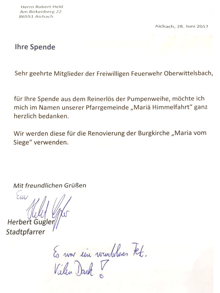 Zur Segnung der neuen Feuerwehr-Pumpe lud die Feuerwehr Oberwittelsbach am 11.06.2017 alle Dorfbewohner zu einer kleinen Feierlichkeit ein. Zahlreiche Oberwittelbacher und Interessierte nutzen das gute Wetter und nahmen die Einladung an.