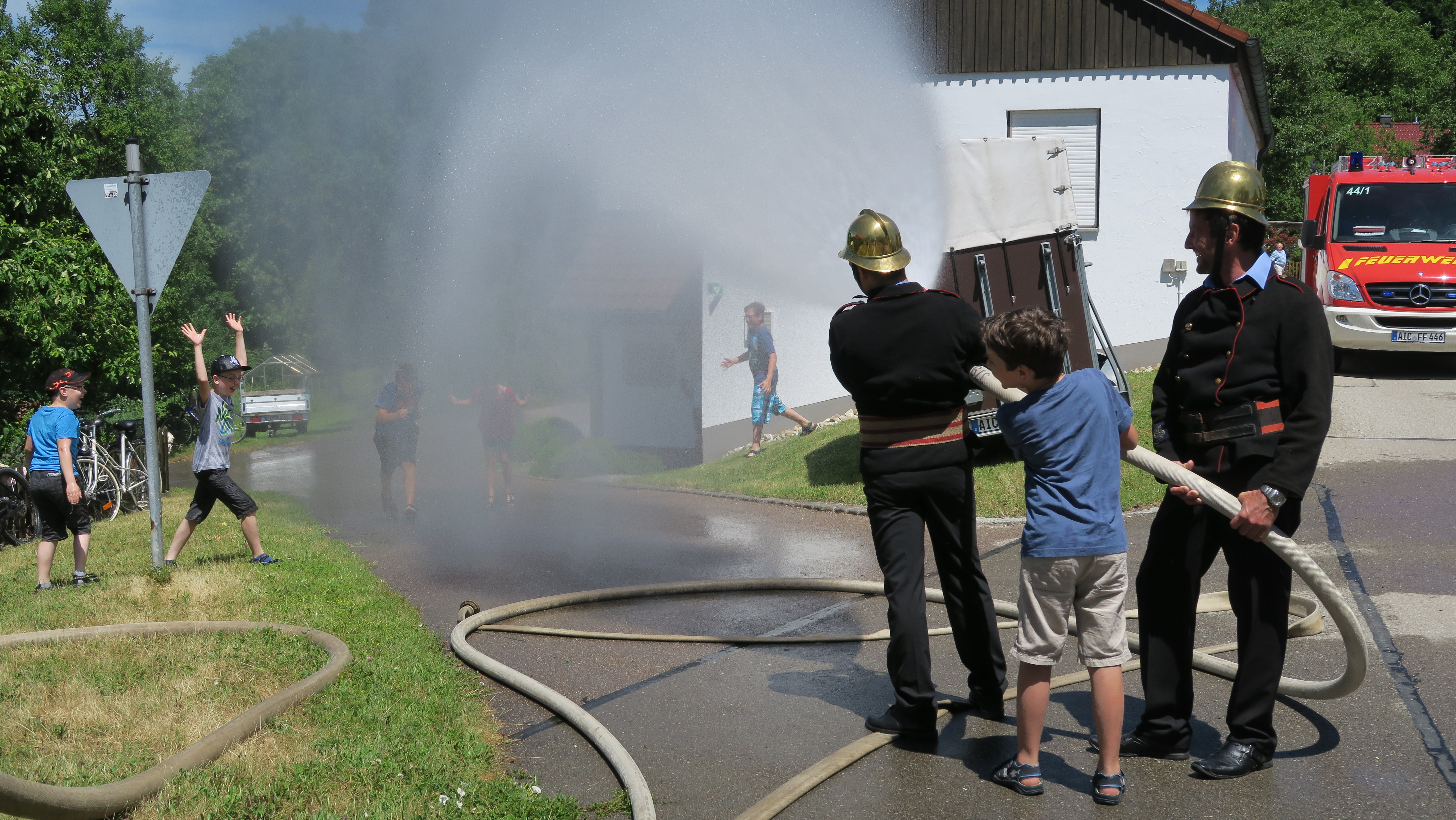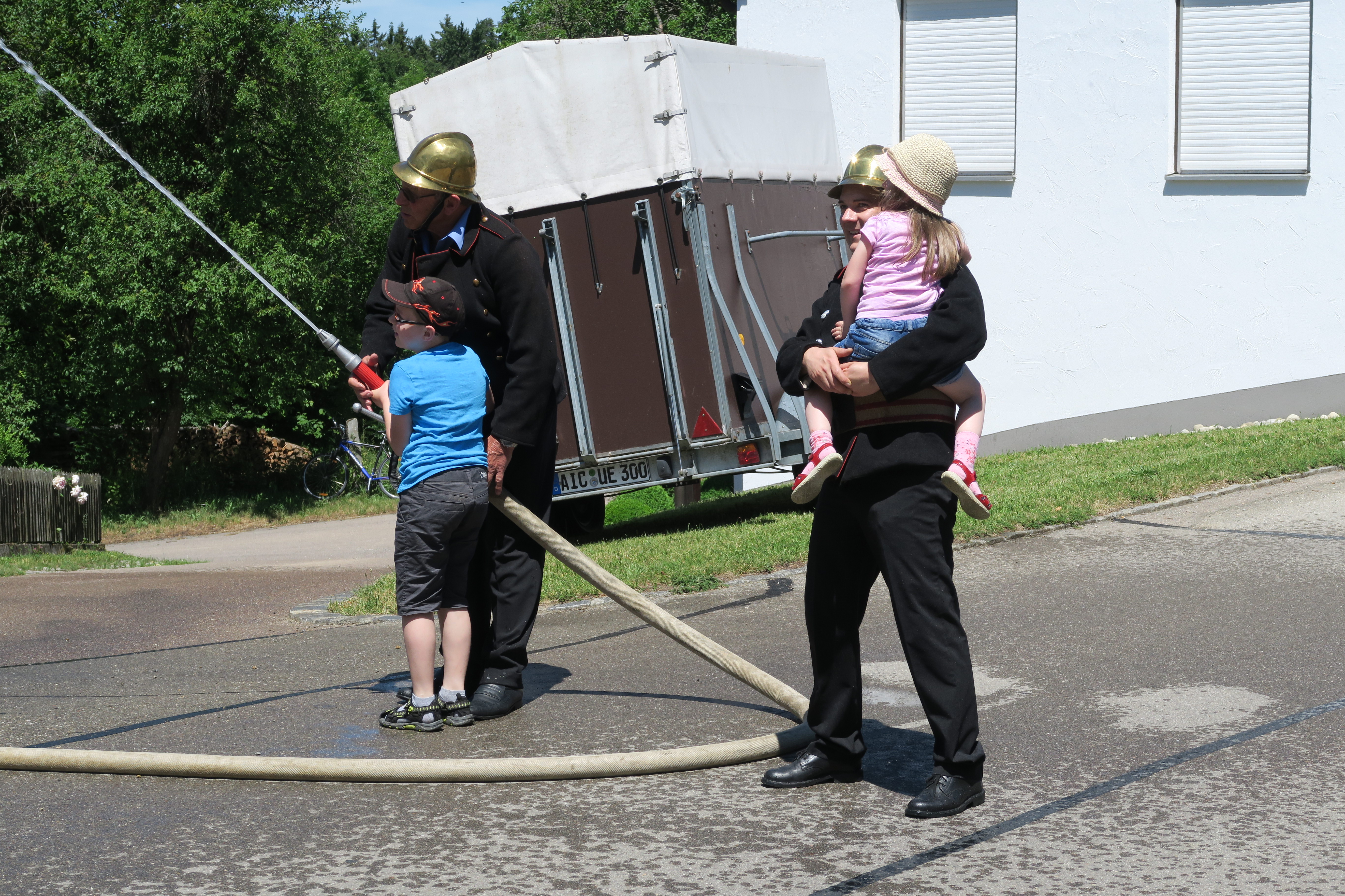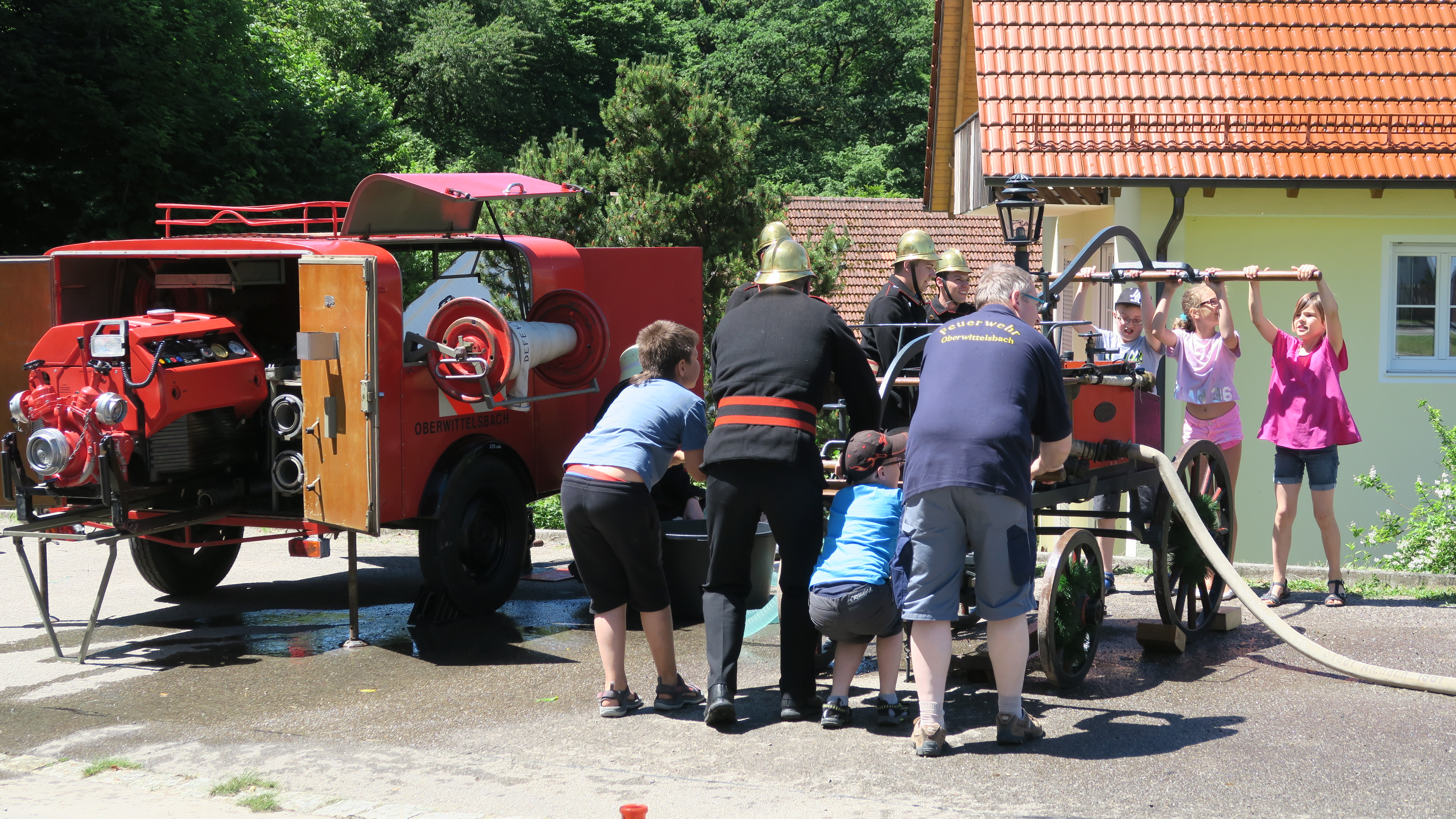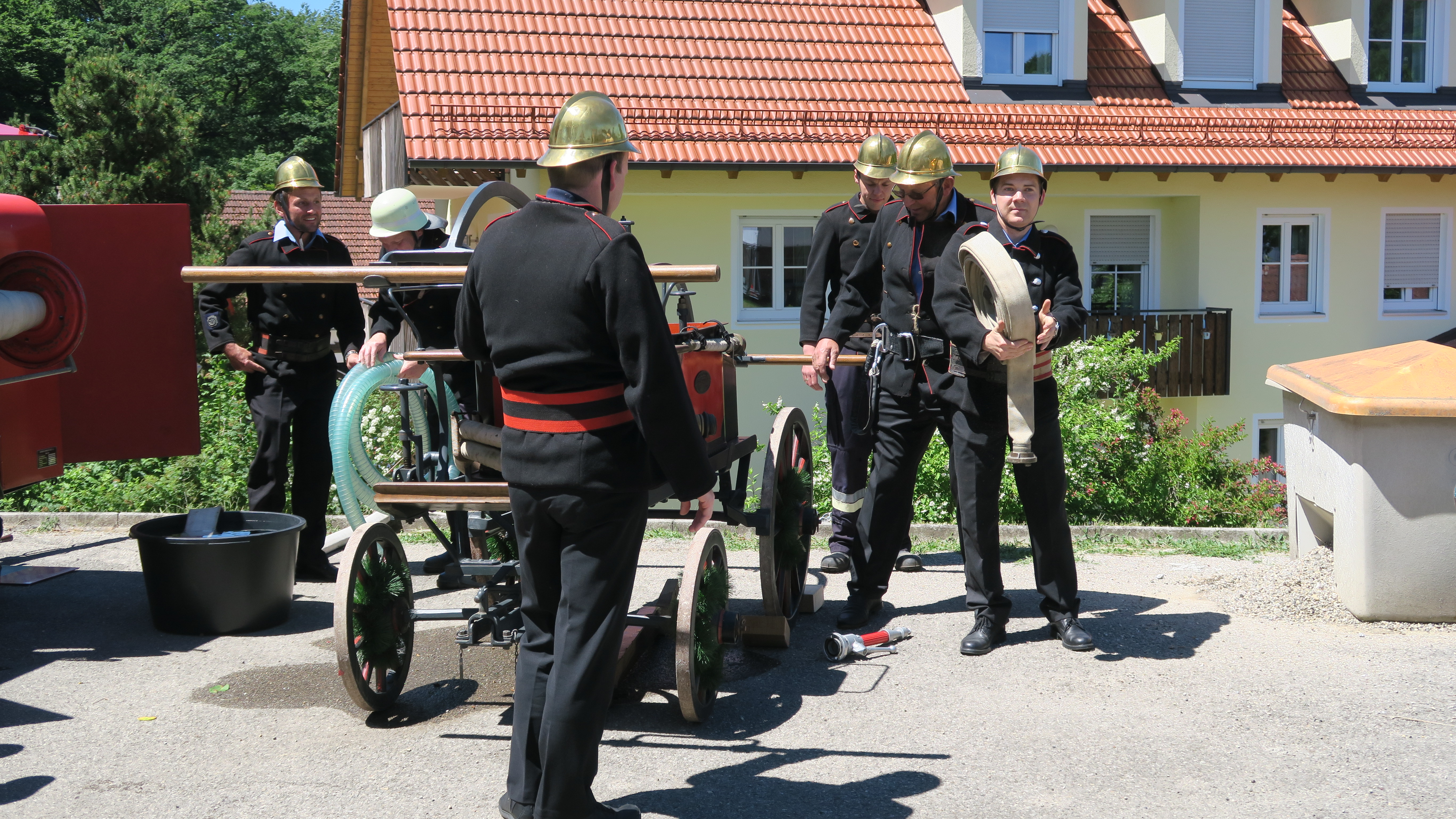 Nach der Segnung durch Herrn Stadtpfarrer Herbert Gugler gab es dann neben der neuen Feuerwehr-Pumpe FOX III auch noch die historische Spritze aus dem Jahr 1890 sowie das Vorgängerfahrzeug einen Tragkraftspritzenanhänger zu besichtigen. Bei einer Vorführung mit der historischen Pumpe wurde dann Geschichte zum Anfassen gelehrt. Neben einer Feuerwehrauswahl durften dann auch noch die Kinder für ordentlich Druck in der Leitung sorgen und kräftig mitpumpen.