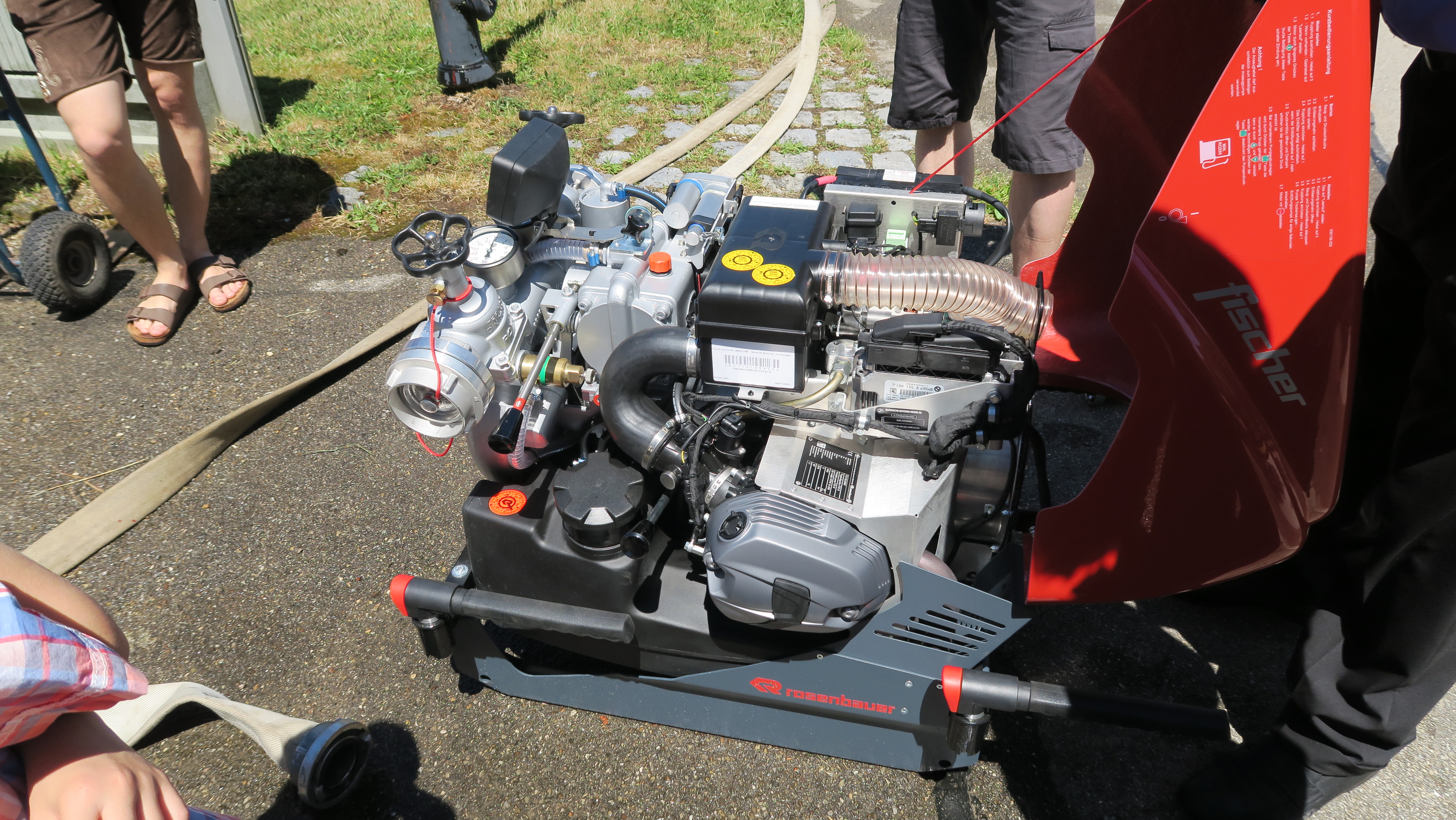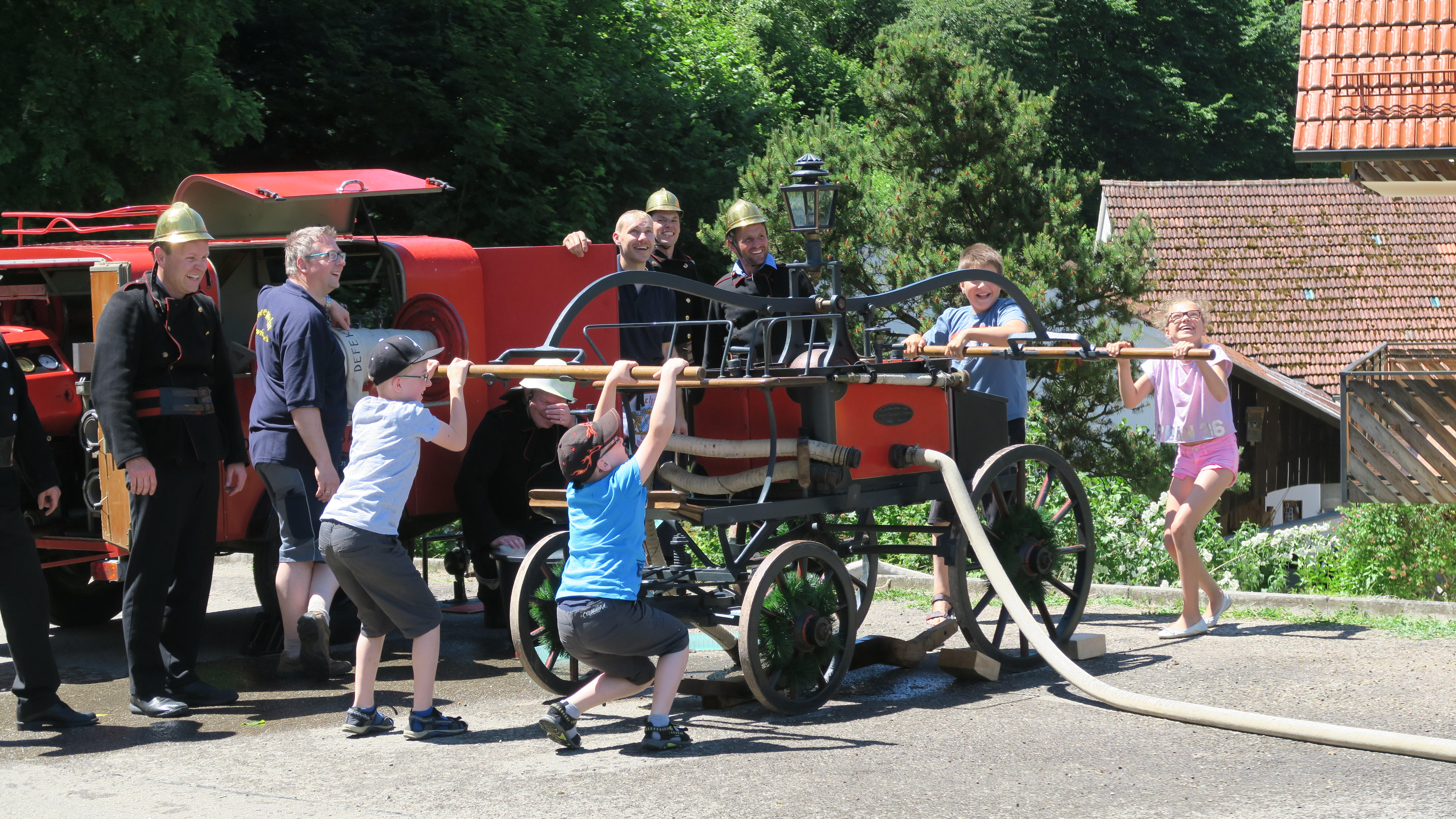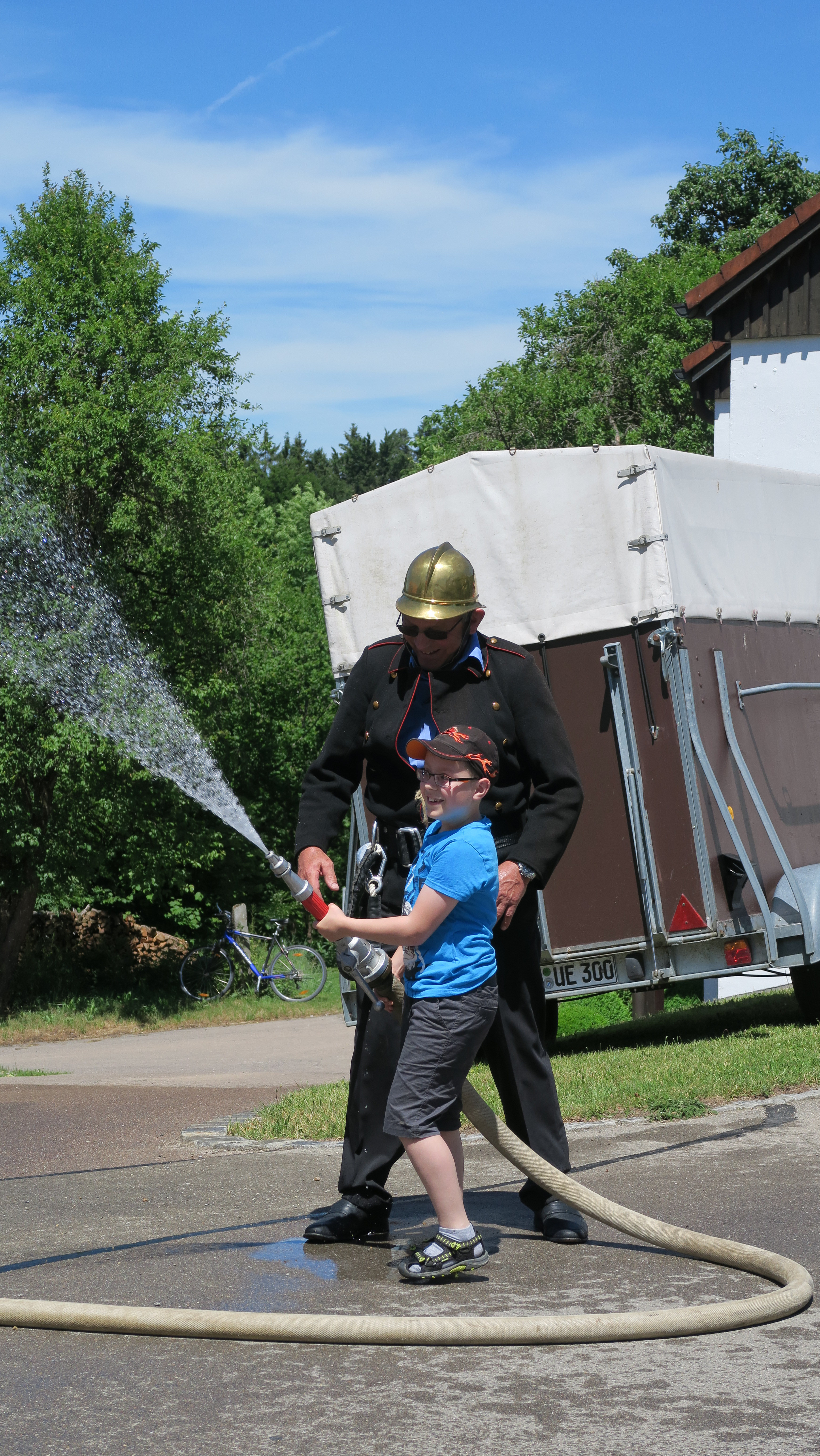 Nach der Segnung durch Herrn Stadtpfarrer Herbert Gugler gab es dann neben der neuen Feuerwehr-Pumpe FOX III auch noch die historische Spritze aus dem Jahr 1890 sowie das Vorgängerfahrzeug einen Tragkraftspritzenanhänger zu besichtigen. Bei einer Vorführung mit der historischen Pumpe wurde dann Geschichte zum Anfassen gelehrt. Neben einer Feuerwehrauswahl durften dann auch noch die Kinder für ordentlich Druck in der Leitung sorgen und kräftig mitpumpen.