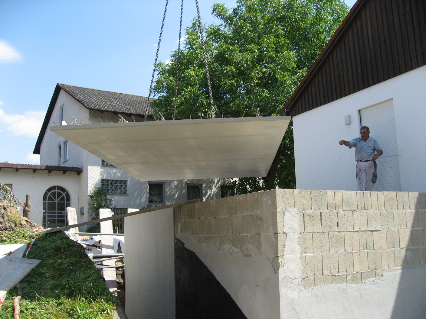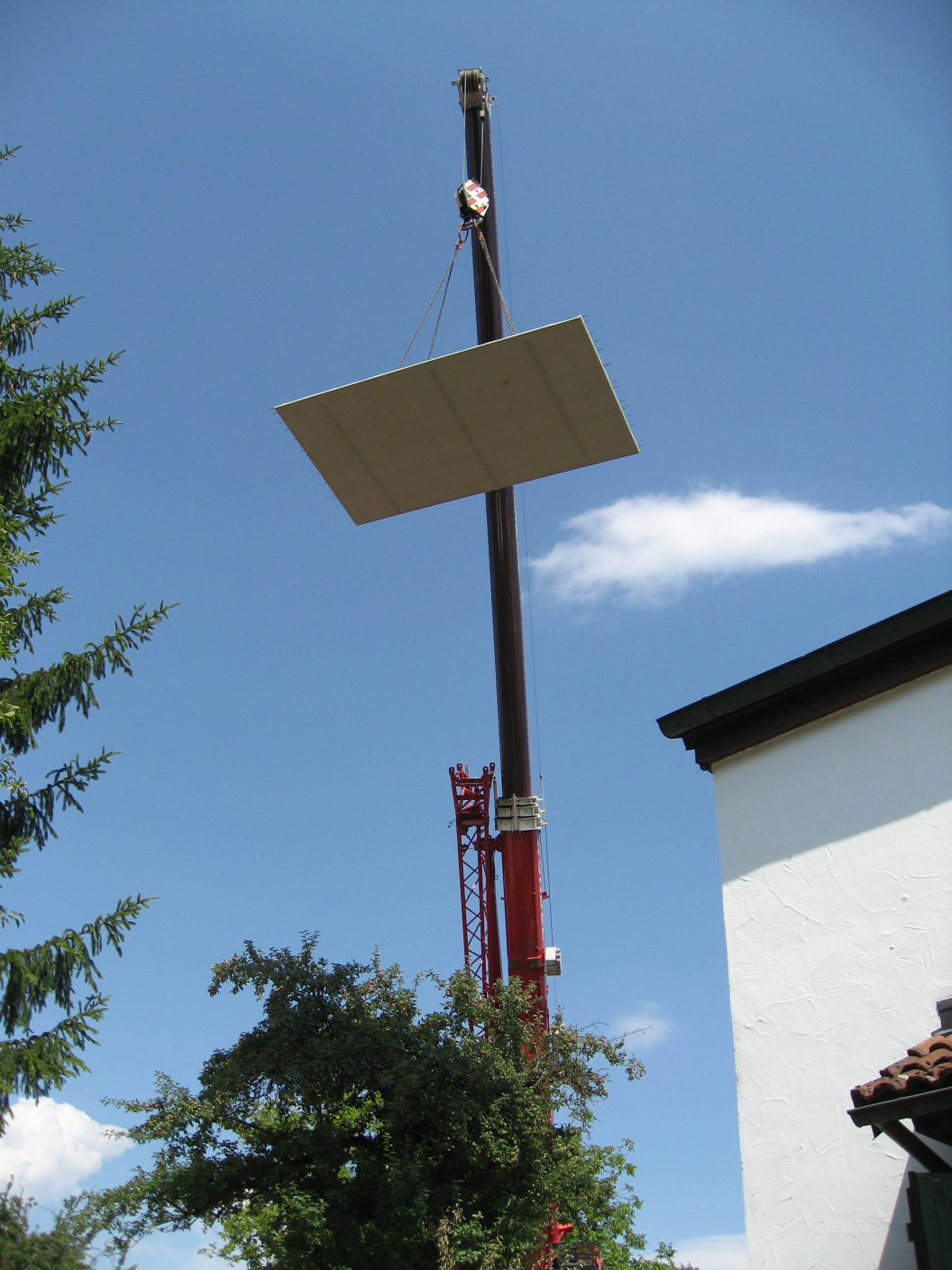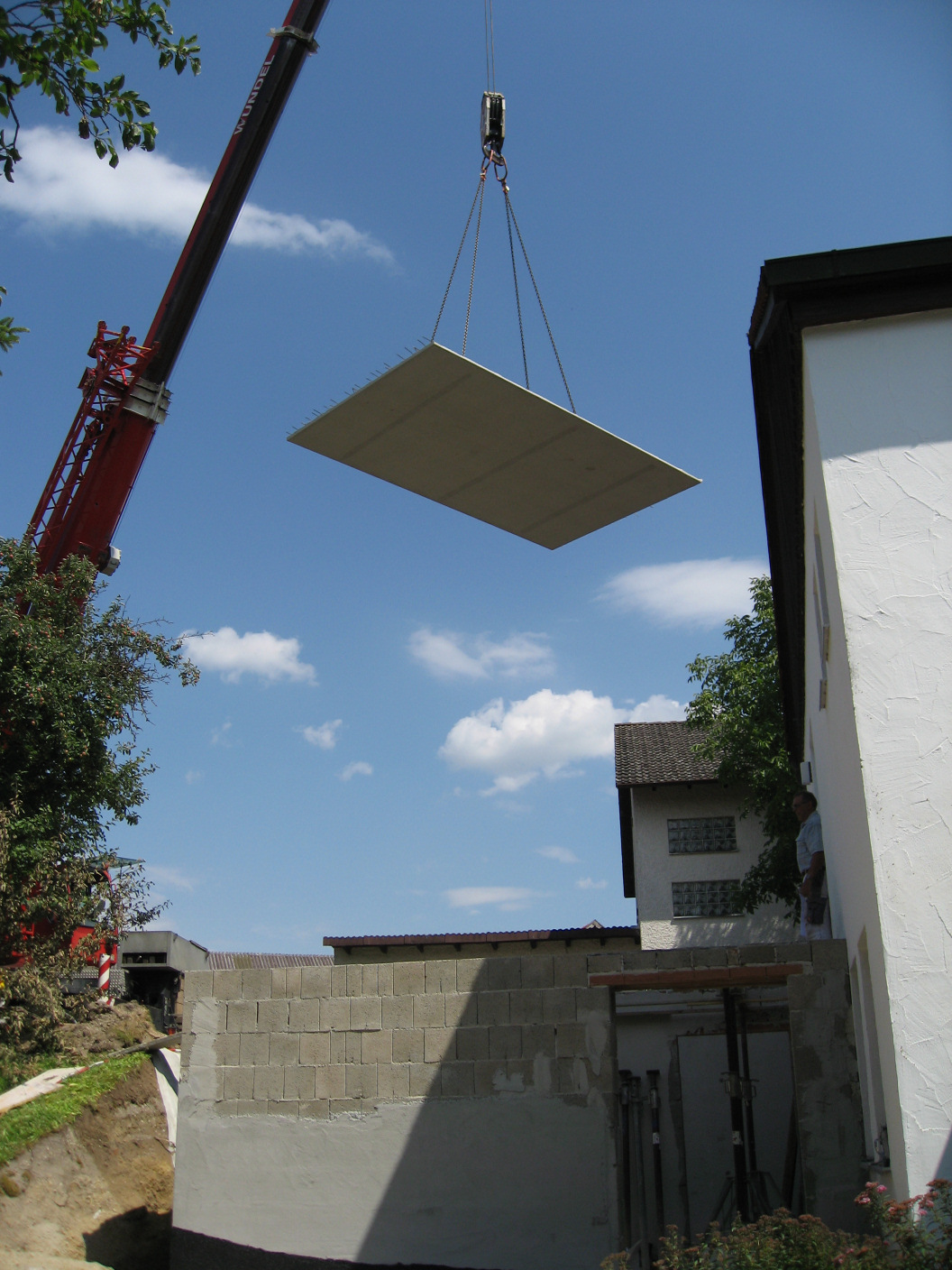 Dann schweben die schweren Fertigteile herbei.