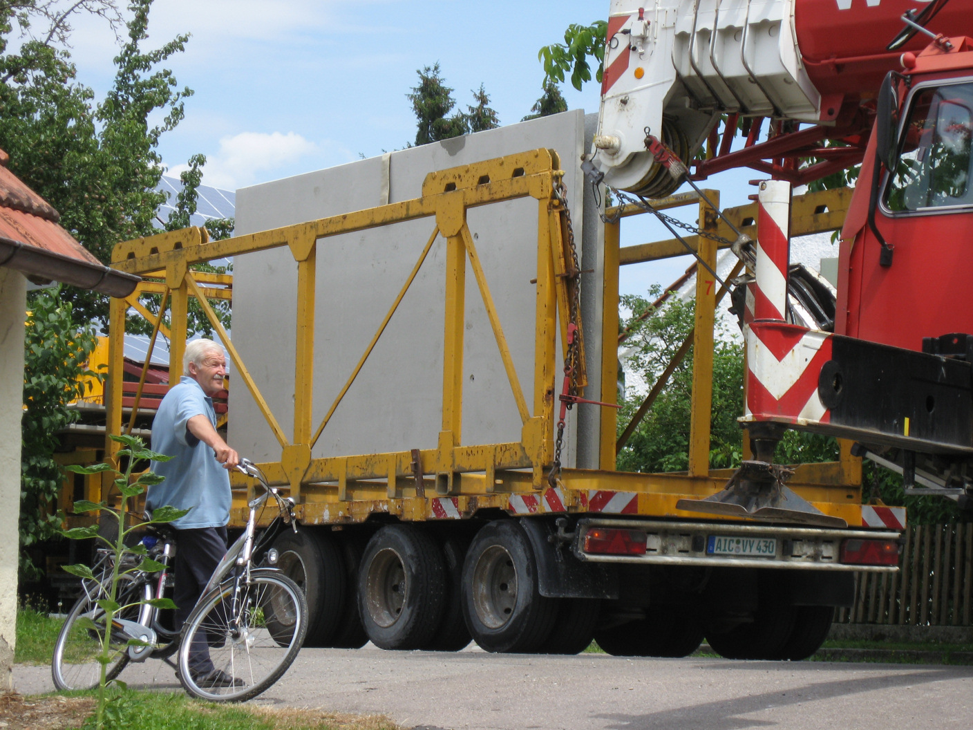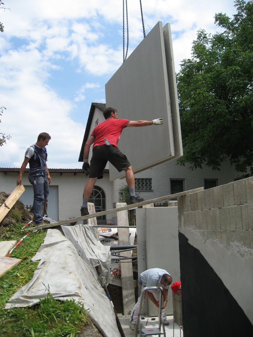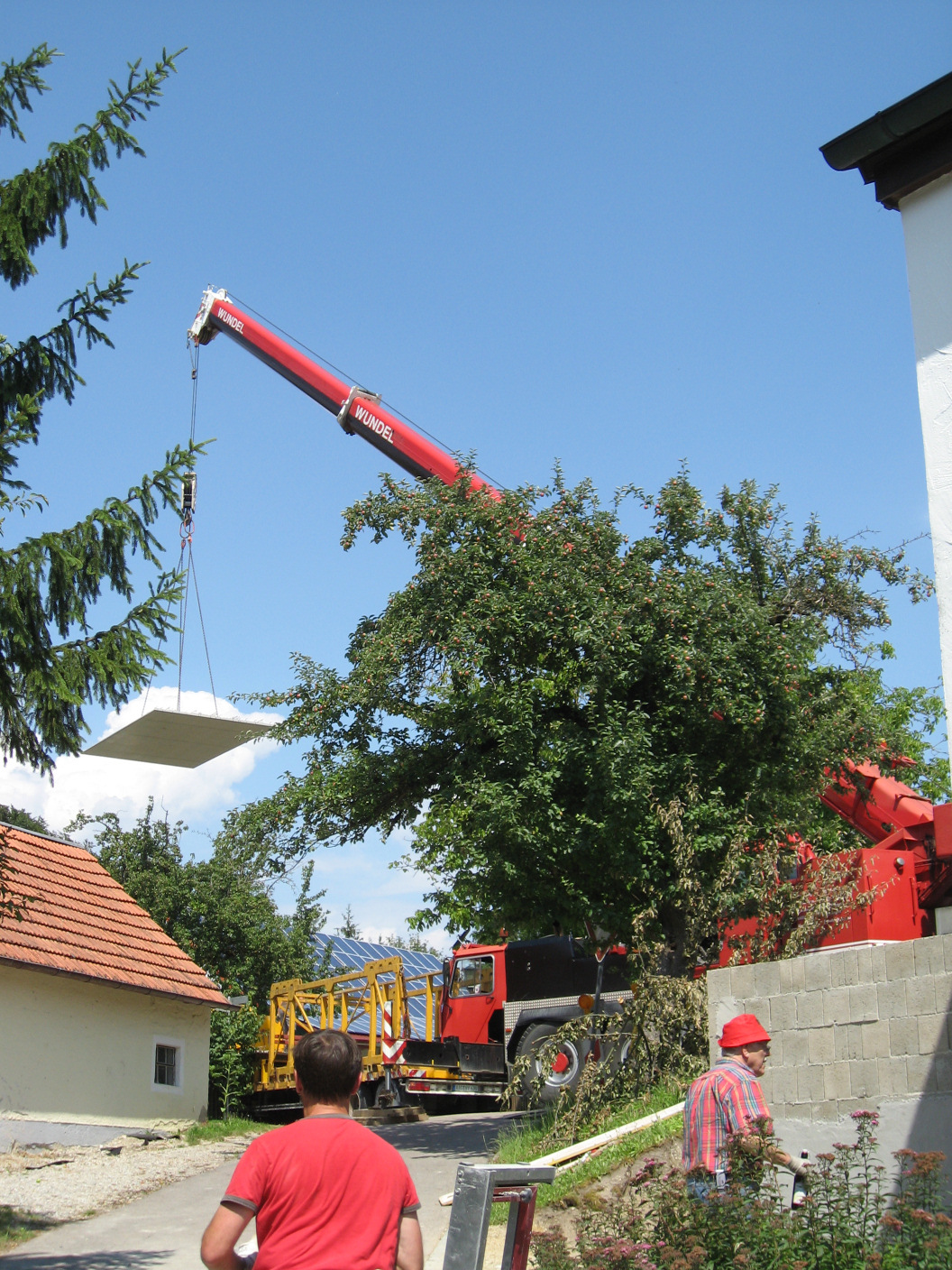 Dann schweben die schweren Fertigteile herbei.