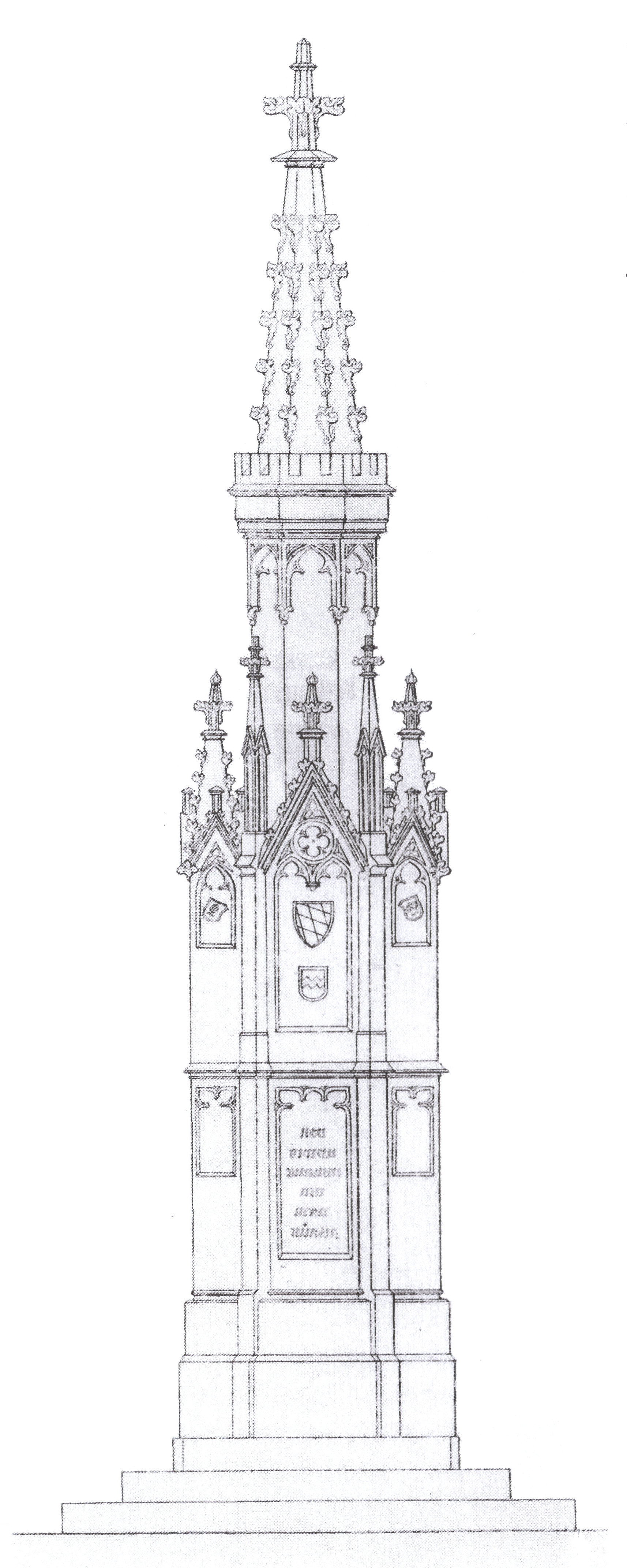 Am 25. August 1834, dem Geburts- und Namenstag Von König Ludwig I. wurde die Fertigstellung des Nationaldenkmals mit einem großen patriotischen Fest gefeiert. An den Feierlichkeiten sollen über 20.000 Menschen teilgenommen haben. Damit hatte die Wiederbesinnung auf die namensgebende Stammburg der Wittelsbacher ihren Höhepunkt erreicht. Bereits 1786 hatte der Aichacher Stadtpfarrer und Deutschordenspriester Dr. Georg Gottfried Higler anlässlich der Geburt der Prinzen Ludwig und Pius aus dem Hause Wittelsbach dort eine Feier veranstaltet, zu der er die Schuljugend nach Oberwittelsbach geführt hatte. Nachdem 1810 ein Scheibenschießen auf dem Burgplatz abgehalten worden war, gab der ehemalige Aichacher Bürgermeister Lorenz Alois Gerhauser den Anstoß zur Errichtung eines ersten Denkmals. Dieses hölzerne Denkmal, das sich am selben Platz befand wie das heutige, war an der Spitze mit einer Fahne geschmückt und trug die Inschrift: Hier stand das Stammhaus Wittelsbach. Dieser Platz bedeckt die Ruinen desselben. So drückt zwar schwer der Schutt der Zeiten das Vaterland, aber der edle Geist der Ottonen lebt nach mächtig in den Regenten Baierns. Gott segne Max Joseph, das königliche Haus und unser Vaterland Baiern. Aufwändigere Pläne, wie die des Münchner Architekten Carl von Fischer dort ein großes steinernes Löwendenkmal zu errichten, ließen sich nicht verwirklichen. Nachdem jedoch der Wunsch nach einem repräsentativen und dauerhaften Monument in breiten Kreisen der Bevölkerung immer stärker geworden war, wurde ab 1821 in ganz Bayern Geld für ein Denkmal auf Wittelsbachs Ruinen gesammelt. Den Entwurf für das neugotische Nationaldenkmal schuf der Münchner Architekt Daniel Ohlmüller. Nach der feierlichen Grundsteinlegung am 25. August 1832 konnte im folgenden Herbst mit den Bauarbeiten begonnen werden. Das 14 m hohe Denkmal wurde aus Sandstein in der Werkstätte von Hippolyt Hautmann in München hergestellt. Als Zeichen der gesamtbayerischen Huldigung sind auf den Seiten die Wappen der acht damaligen bayerischen Bezirkshauptstädte angebracht. An der südlichen Schauseite ist die Widmungsinschrift zu lesen: Seinem tausendjährigen Regentenstamme das treue Bayern | Errichtet im achten Regierungs-Jahre Koenig Ludwig des I.